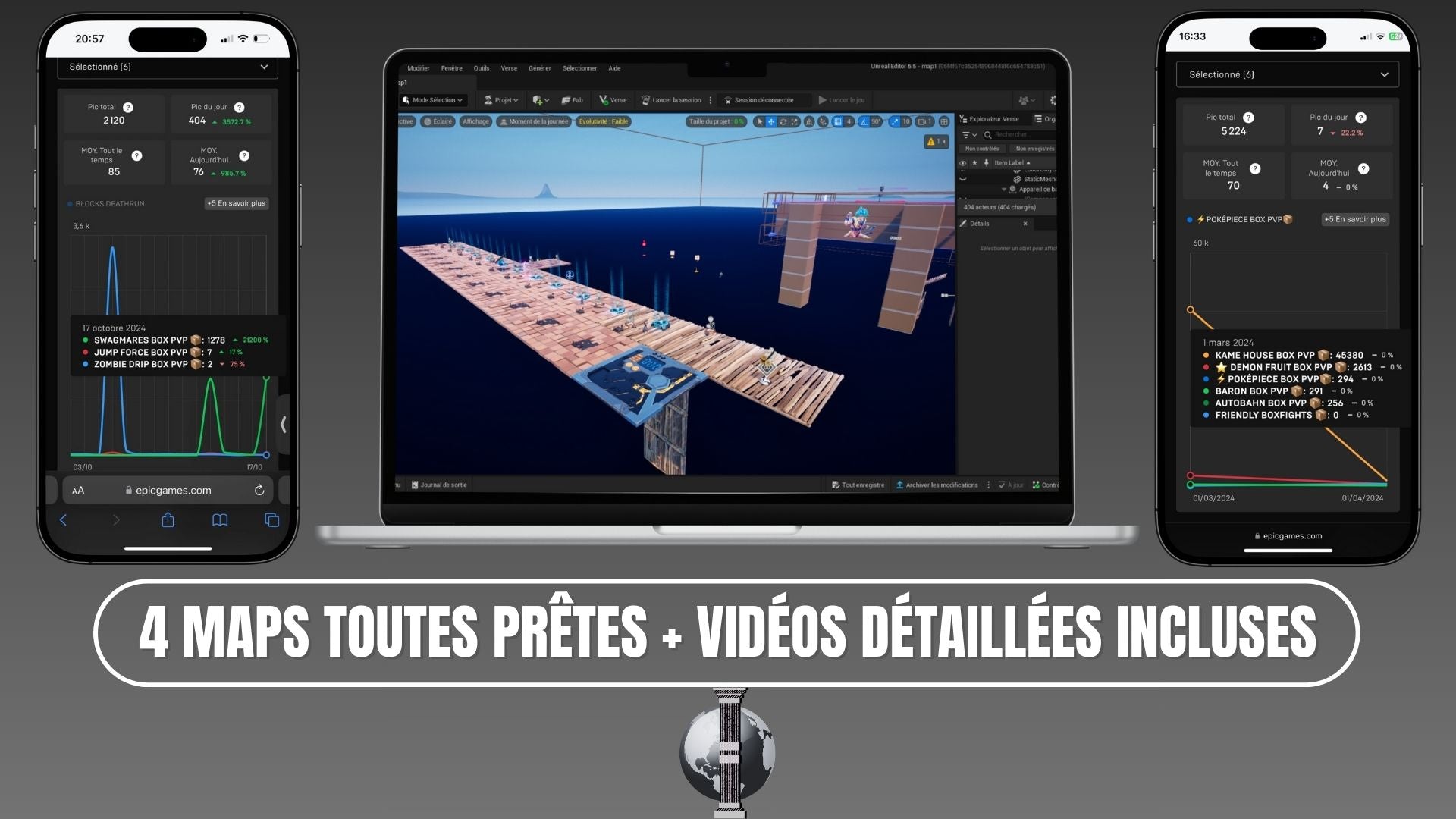 4 maps clés en main : Conçues selon les dernières tendances UEFN, prêtes à être déployées et générer des revenus immédiats.
